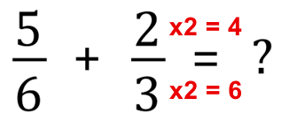 Now this is a slightly different case, here we just can’t simply add up 5 and 2 because our denominators aren’t the same. We need to make the denominators the same, this is called “finding a common denominator” and it involves finding a number that we can multiply one or both of the denominators by to make them the same. Now in this particular case it is quite easy, if we multiply the denominator 3 x 2, we have a denominator of 6 but we also have to remember to multiply the numerator by 2 otherwise we have changed the value of the fraction.