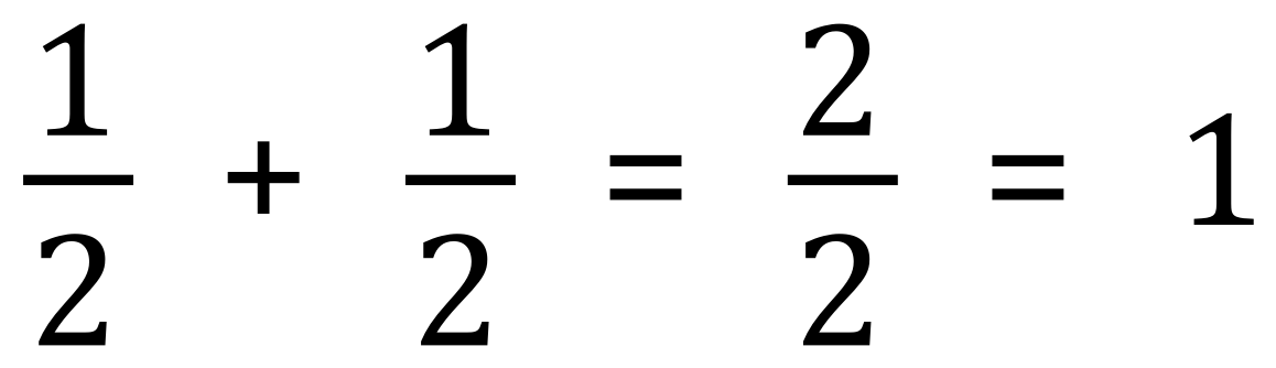 Because each of the fractions on the left are “halves”, we can just add up the numerators to give this answer. Just a note here, whenever the numerator and the denominator are equal, we have “one whole”, and it doesn’t matter how big the numbers are, if they are the same, we have “one whole”. To add and subtract fractions we have to make sure first of all that the denominators of the same.