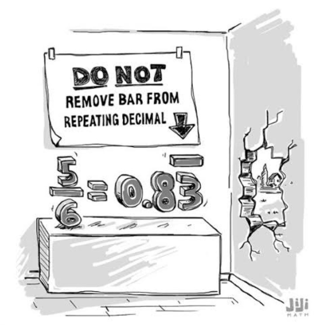 One such method, as the cartoon suggests is to put a small horizontal bar above the number which is to repeat. In the case of the cartoon the decimal would be 0.8333333...... with the number three repeating indefinitely to the right .