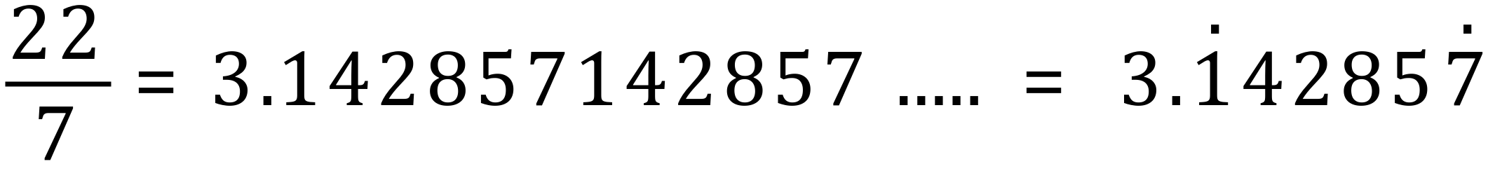 Finally, a number such as our 1960s/1970s improper fraction version of pi would be written like this, with just the boundary values of the repeating block highlighted using dots:
