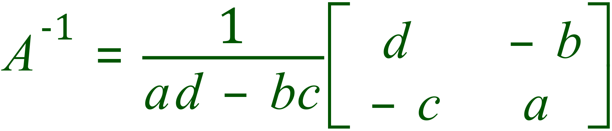 To calculate the inverse of a matrix we use the following formula (note that this discussion will stick to simpler 2×2 matrices, there are ways to calculate the inverse of higher level matrices but this involves mathematics which is way beyond the scope and intention of this section).