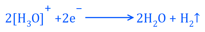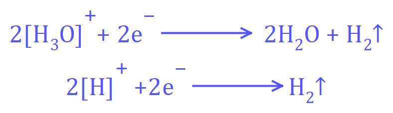 Either of these representations would be acceptable, the reduction of the Hydroxonium ion to water and Hydrogen gas or the reduction of protons to Hydrogen gas.