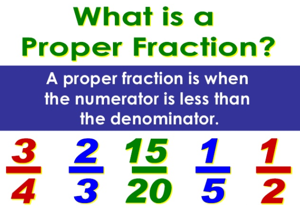 Generally, the numerator is bigger than the denominator, because a fraction is usually part of the whole, not equal to it or more than it. Having said that sometimes the numerator can be bigger than the denominator, this doesn’t seem right so it is referred to as an improper fraction, whereas the fraction that we are used to is called a proper fraction. Let’s take a look at these other fraction types now: