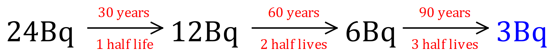 Q. A sample of Caesium-137 is found to have an activity of 24 Bq. Caesium-137 has a half-life of 30 years. What will the activity be, in Bq, at 90 years?