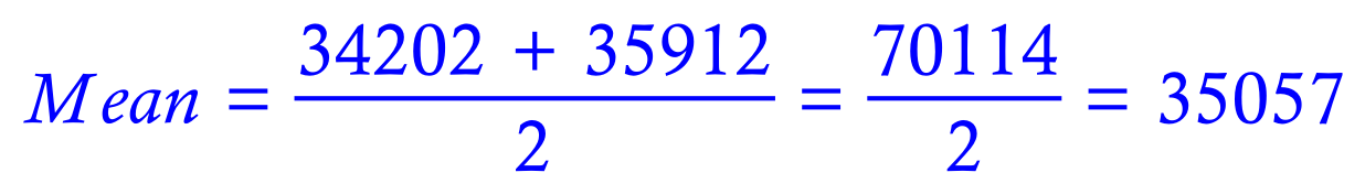 There is a slight complication because we have an even number of values, which means that the median value lies between the two values at the centre, it is in fact the mean of these two values. In this case the median value is the mean of 34,202 and 35,912 which is: