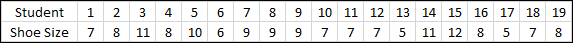 The data above shows the individual shoe sizes of 19 students in a class. If we add up the values of all 19 students and divide by 19 we come to a "Mean" of 153 with an average shoe size of size 8. We might be interested in some of the features of this dataset, for example the largest size which we can see is 12, the smallest size which we can see is 5 but sometimes more interestingly the value that seems to be the most common or the value that is in the middle of the dataset. In the first case the most common value is known as the Mode or Modal value, and in the second case the middle value (when the data has been put in order from smallest to largest) which is known as the Median value.