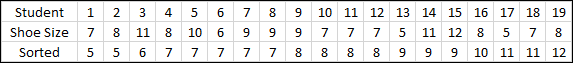 Even a simple job like sorting the shoe sizes into numerical order makes the data a little bit easier to interpret. We can see straight away that the smallest size is 5 and that the largest size is 12, we now have a range of values which means our seemingly random data is now starting to become useful information. We said previously that the median size would be the middle value. We have 19 values so the middle value is going to be the one lying in position 10. We can see that this is actually 8, so the median value (the middle value) is size 8. In such a small table it's not difficult to identify the median, but if the table contain hundreds of data items you would hopefully be looking for an easy way to work out the median.