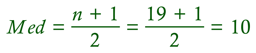 If we take the total number of items (in this case 19) as a value for "n", we can see that the median value will lie at position 10 as I said previously. A slight complication can arise when we have an even number of data items. In the previous example we have 19 data items, so the will be a "middle value" if we write the numbers down (this will be the value lying at position number 10). What do we do though, if we have an even number of data items? There isn't actually a "middle value" so we take the two values lying either side of where the middle would have been, and we take the mean (average) of these two values. This becomes our Median value.
