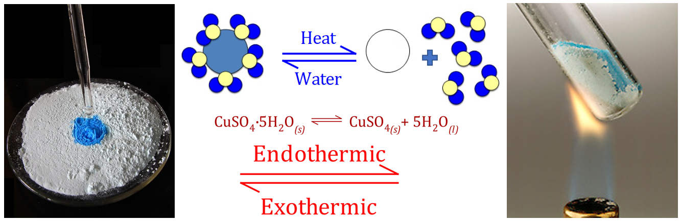 The dehydration and rehydration of Copper Sulphate is also reversible, and in fact the rehydration is a common test for the presence of water. Copper Sulphate in its hydrated form is a beautifully deep blue colour, but the water of crystallisation can be driven off under intense heat to leave a white powdery "anhydrous" Copper Sulphate.