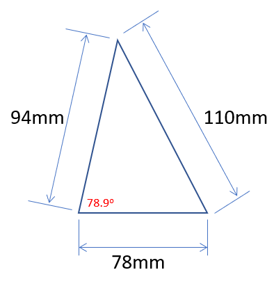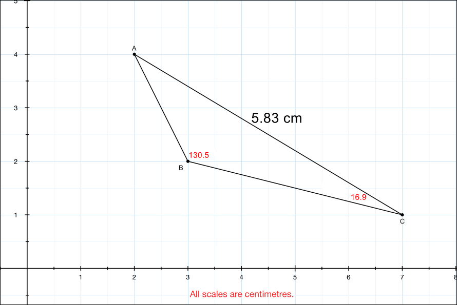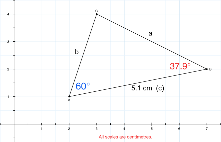 Q4. The triangle ABC is shown on gridded paper, scaled in centimetres. Side AC (a) = 5.83 cm.