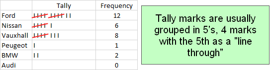 You can probably see that it would be simpler to collect your data this way, rather than try to write "Vauxhall" or "Peugeot" quickly in succession. The tallies are simply "totted up" at the end of the survey to produce the frequency.