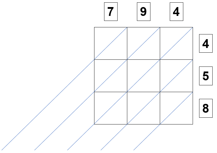 In a similar way to the "grid method", a suitable size grid is constructed according to the number of digits in the numbers to be multiplied. Just for the sake of convenience I've deliberately chosen the same numbers as before, so we need a 9 square grid (3 x 3). The obvious difference this time is that diagonal "separators" cut each square into two triangles, and these triangles are the placeholders for the products of the numbers on the intersecting lines. Let's make a start so that this is a little bit clearer.