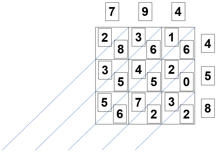 I said previously that the order in which these small multiplications were to be carried out didn't matter, but the next step (the adding up) must be done from "bottom right" to "top left" because in some cases the result of each small addition may exceed 9, in which case there will be a need to "carry".