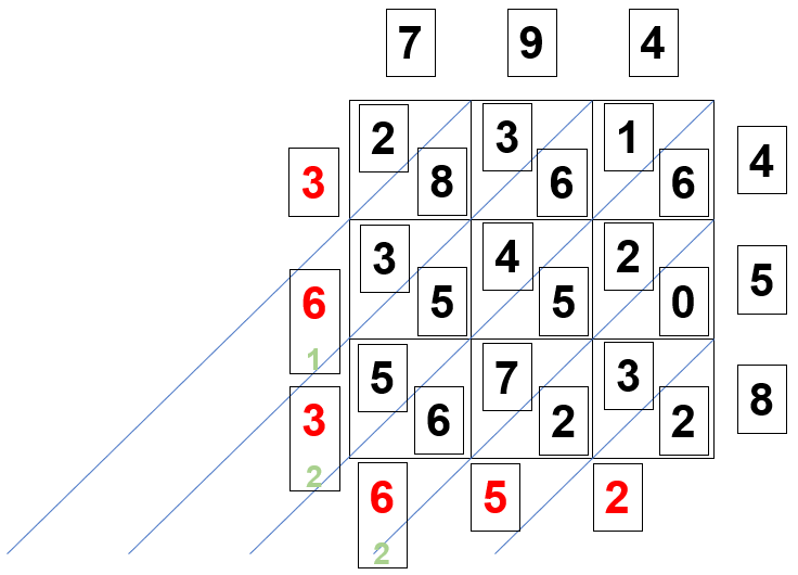 Starting at the bottom we simply move the 2 down. We then move up left to the first "diagonal column" and we add together 0+3+2 which equals 5. We write 5 in the diagonal section outside the grid and then move onto the next "diagonal column" where we add up 6+2+5+7+6 which equals 26, we put the 6 in the diagonal section outside the grid and carry the 2.